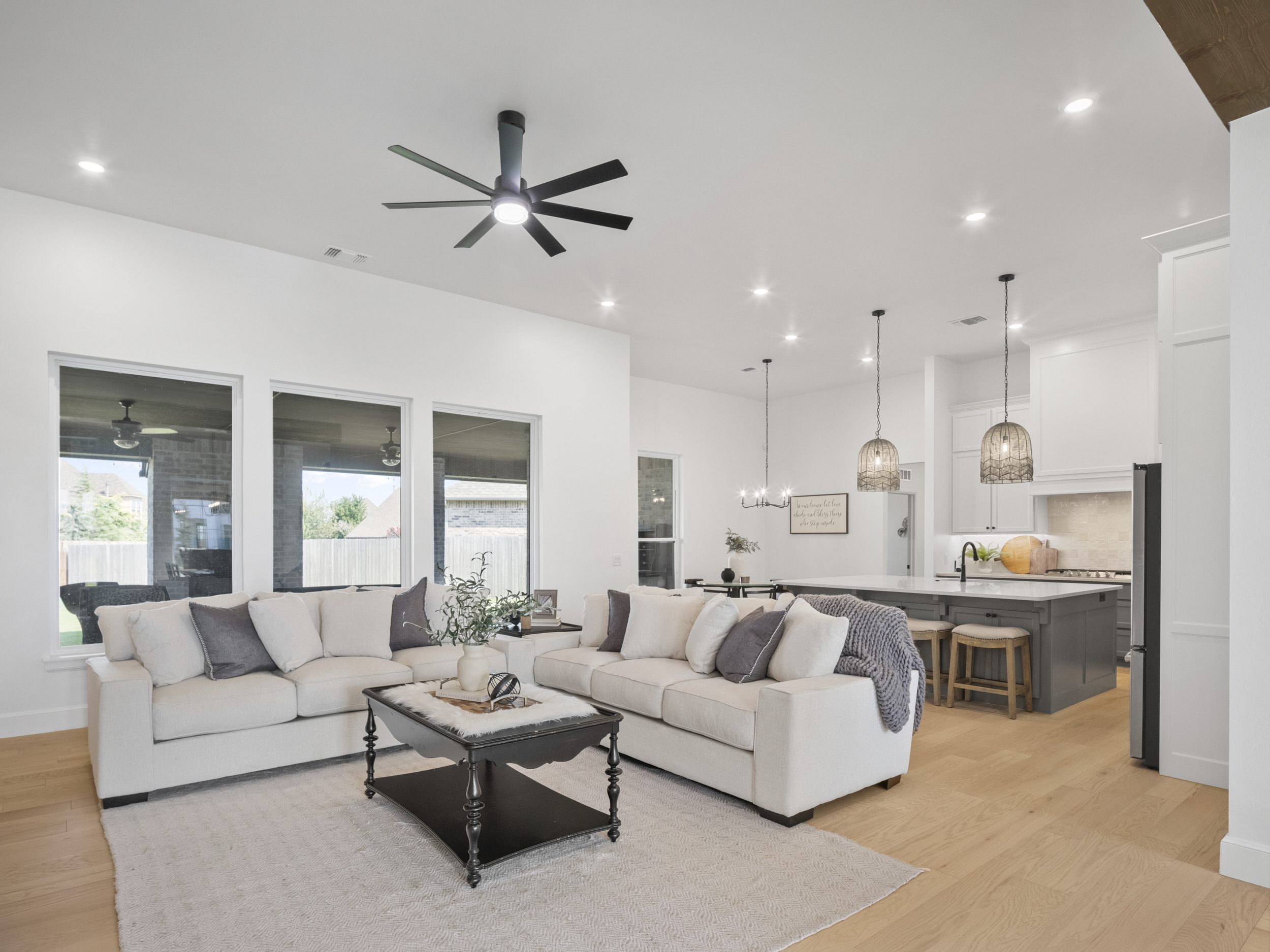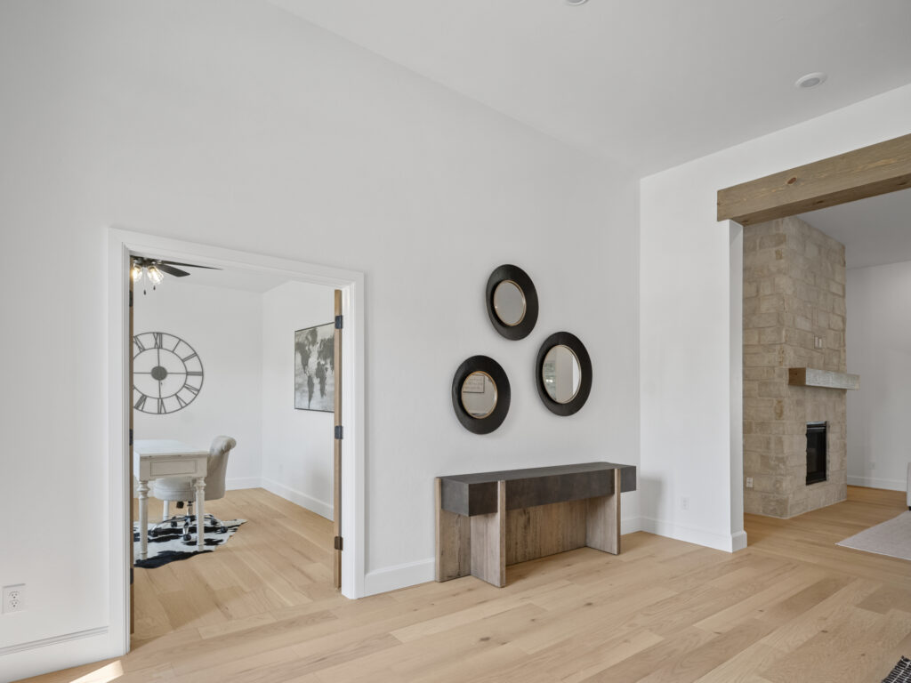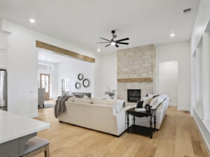 This home features four bedrooms and three and a half bathrooms, combining contemporary design elements with natural, rustic accents. The house boasts a charming exterior with modern and rustic elements. The facade combines clean lines, natural materials, stone, and wood, creating a warm and inviting atmosphere. Large windows and a covered porch provide an excellent connection to the outdoors. Upon entering, you step into an open-concept living area that seamlessly integrates the kitchen, dining room, and living room. The space is characterized by high ceilings, a stone fireplace, and large windows, allowing ample natural light to flood the area. The flooring is light creating a modern rustic feel. The kitchen features sleek, modern appliances and fixtures. A large center island provides additional workspace and doubles as a breakfast bar. Nestled off of the kitchen are 3 secondary bedrooms and two baths that are anchored by a second living area. This is a great space to watch a movie, do homework or play games. The primary retreat features rustic beams with a lot of natural light. You will love the seclusion this retreat offers as well as the spa-like bath. The center stage of the primary bath is the freestanding tub. Relaxation is easy in this space. The Primary Closet has a center chest of drawers with seasonal rods. If you love outdoor living this home has it. There is plenty of space for a seating and dining area around the outdoor fireplace. A study, 1/2 bath, & formal dining complete this home.